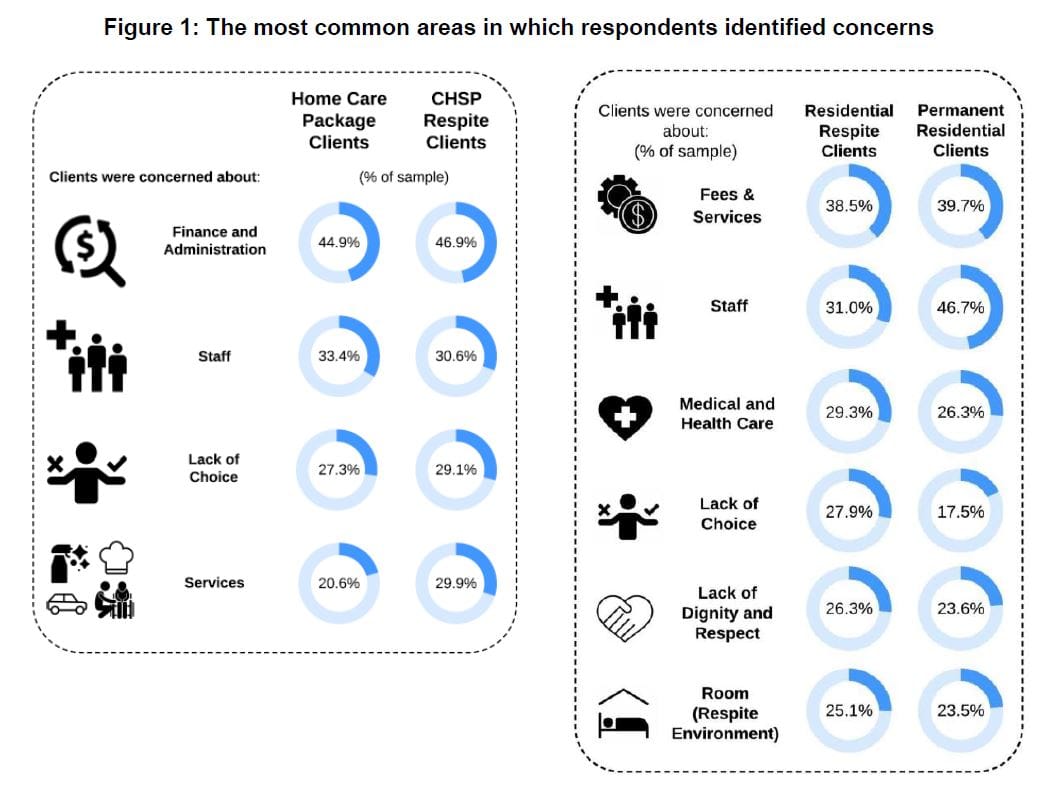 The surveys find only 25% of aged care residents and home care clients feel that their care needs are always met, with 39% in residential care and 32.5% in home care saying their needs are ‘mostly’ met. 33.4% of people in residential care and 44.1% in home care report that their care needs are met ‘sometimes’, ‘rarely’ or ‘never’ – with these figures higher among people using aged care respite services. Survey respondents also identified a number of concerns with their care. Among aged care residents, the most common concern was unsurprisingly staffing (46.7%), including a lack of staff, call bells not being answered, high rates of staff turnover, inadequate training, and agency staff not knowing the resident or their needs. Services and fees were the next biggest concern (39.7%) followed by medical and health care (26.3%). In home care, the top concerns were around finance and administration, including lack of value for money, fee transparency, service coordination and rostering.