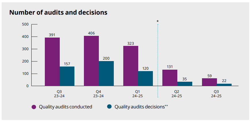 The Standard with the lowest rate of compliance was Ongoing Assessment and Planning with Consumers, with only 73% complying. The March quarter saw a sharp decline in regulatory activity, with just 59 quality audits and 22 decisions recorded – down from 391 audits and 157 decisions in the same quarter last year.