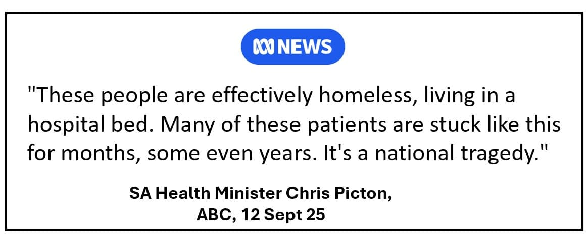 Across Australia, 2,000 hospital beds now hold 2,000 older Australians getting sicker, waiting for an aged care bed. The cost: $1,500 to $2,000 per day. Solution: a co-located village home at $533 a day.