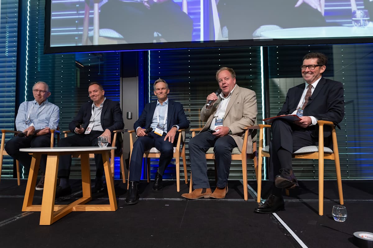 Jim Hazel (left), Director of Omega Communities and former Chair of Ingenia Communities, speaks on whether to acquire or build a retirement village, with Mark Fay, CEO of IPLiving, Hugo Dudley-Smith, Managing Director at Gresham Partners, Jolyon Good OAM, CEO of Good Constructions and DCM Group CEO Chris Baynes.