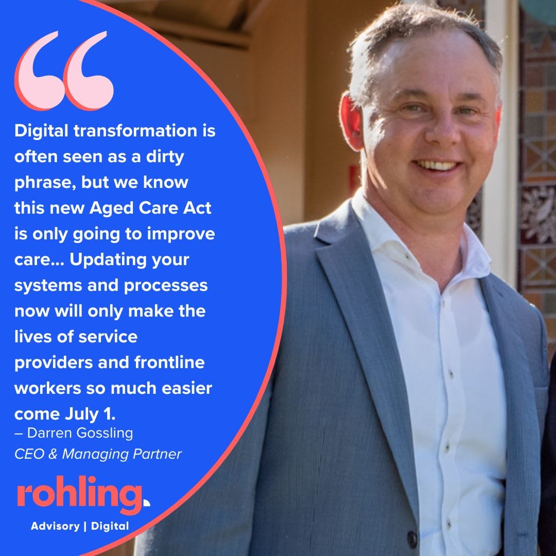 Here is the problem: there are only weeks, not months to get ready. A well-organised, multi-pronged approach is needed. Operators need to quickly understand current state and risks then develop a roadmap for changes to technology, business process and up skilling of staff and teams. This requires planning the basics first, and then prioritising and staging changes so that the most urgent foundational requirements are implemented as needed while investment decisions can be made in parallel. Rohling, which supports residential aged care and home care providers across the country, conducts digital maturity assessments to help organisations map their current systems, spot redundancies, and plan tech investments strategically. Many providers are running as many as 30 pieces of software and hardware – often disconnected and underused – across their business. Rohling has deep expertise in leading significant business changes that must be integrated across technology, business process and the workforce.