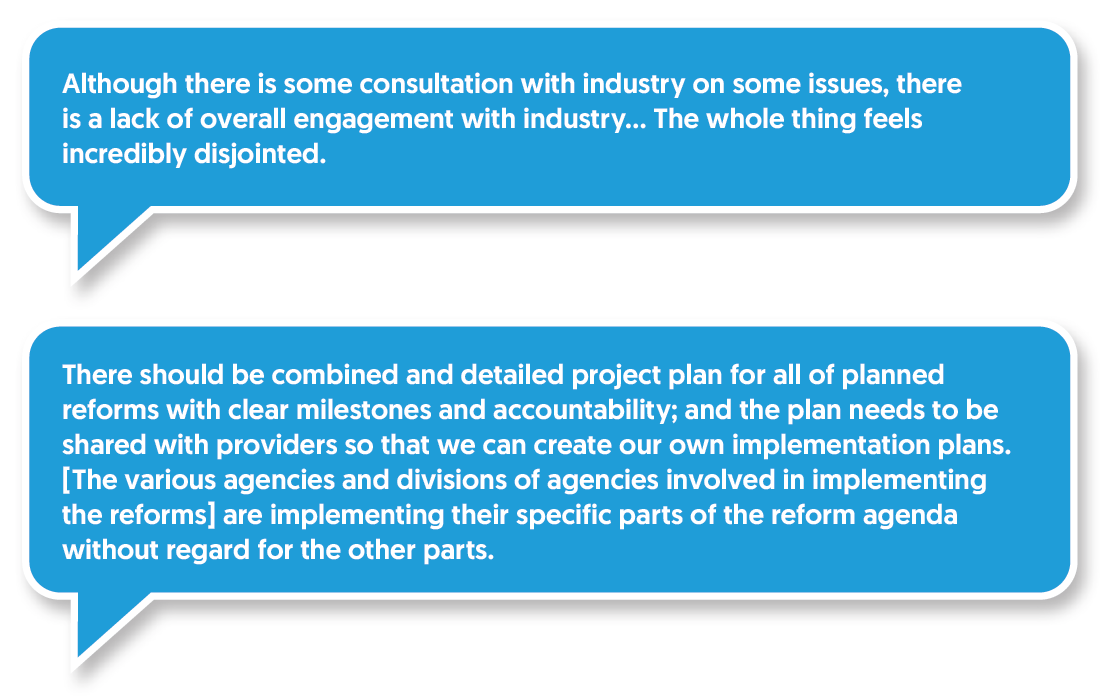 Comments from providers reflect on the “disjointed process” and lack of a detailed plan for all of the reforms with clear KPIs.