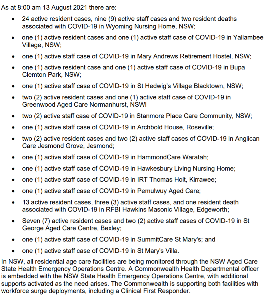 More states have taken up the Federal Government’s 17 September deadline for residential care workers to have at least one dose of a COVID-19 vaccine as the NSW COVID-19 crisis continues to worsen. 24 aged care facilities in NSW are now experiencing COVID-19 outbreaks, and another 10 under close surveillance due to recent cases, as Premier Gladys Berejiklian warned on Wednesday, the State “hasn’t seen the worst of it”. This information graphic was provided by the Federal Department of Health, showing