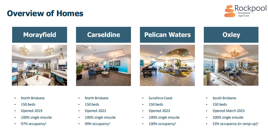The net cash outlay includes Refundable Accommodation Deposit liabilities of approximately $204 million. The price equates to $225,000 per bed, net of RADs. Regis anticipates receiving an additional $40 million in future net cash inflows from RADs as Oxley, which opened in March, ramps up to full occupancy. The sale will free up capital for Rockpool to continue development of its three remaining aged care sites at Northshore Hamilton, Kedron, and Southport, which it will retain. Details of the four homes being acquired are shown in the table below - they are large, new, high end, and full, apart from Oxley.