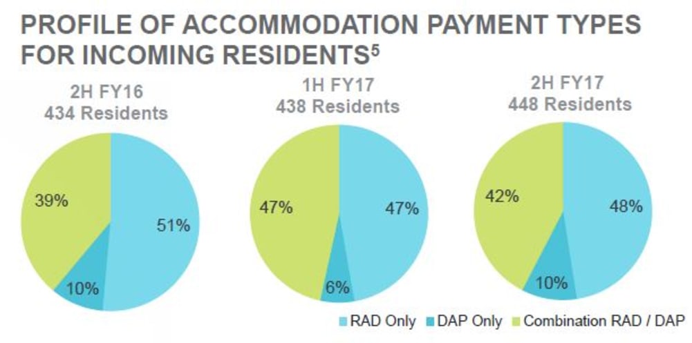 Their FY17 results reveal the operator’s revenue per occupied bed day has moved to $281 compared to $272 in FY16, with 48% of new residents opting to pay a Refundable Accommodation Deposit (RAD) over a Daily Accommodation payment (DAP) or a combination RAD/DAP payment.