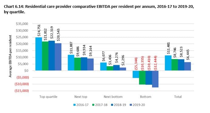 As a whole, residential providers reported an overall loss of $736 million in 2019-20, compared with a total profit of $264 million in 2018-19 – the third year in a row of falling financial performance, with average EBITDA having decreased by almost 44% since 2017-18.