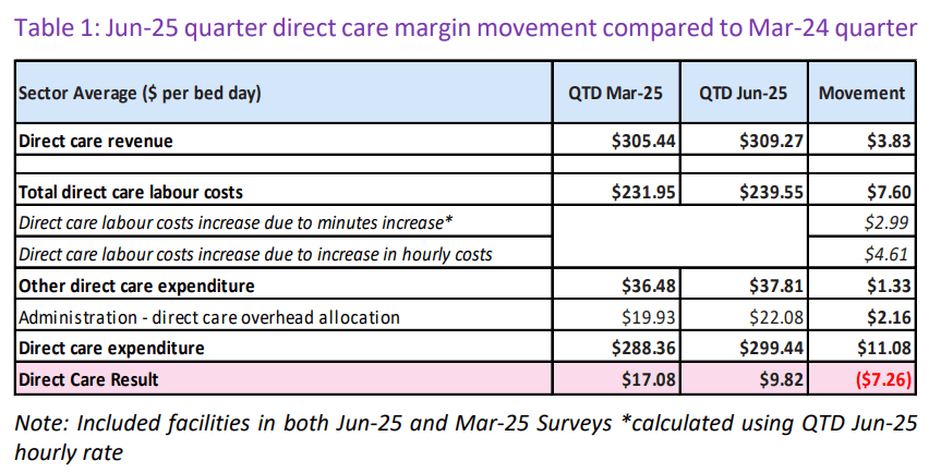 Providers recorded an average operating deficit of $3.10 per bed day (pbd), nearly double FY24’s $1.58 pbd shortfall. Losses deepened in everyday living services (to -$7.13 pbd from -$5.61 pbd) and accommodation services (to -$12.05 pbd from -$11.22 pbd). Direct care – traditionally used to cross-subsidise those losses – also weakened.