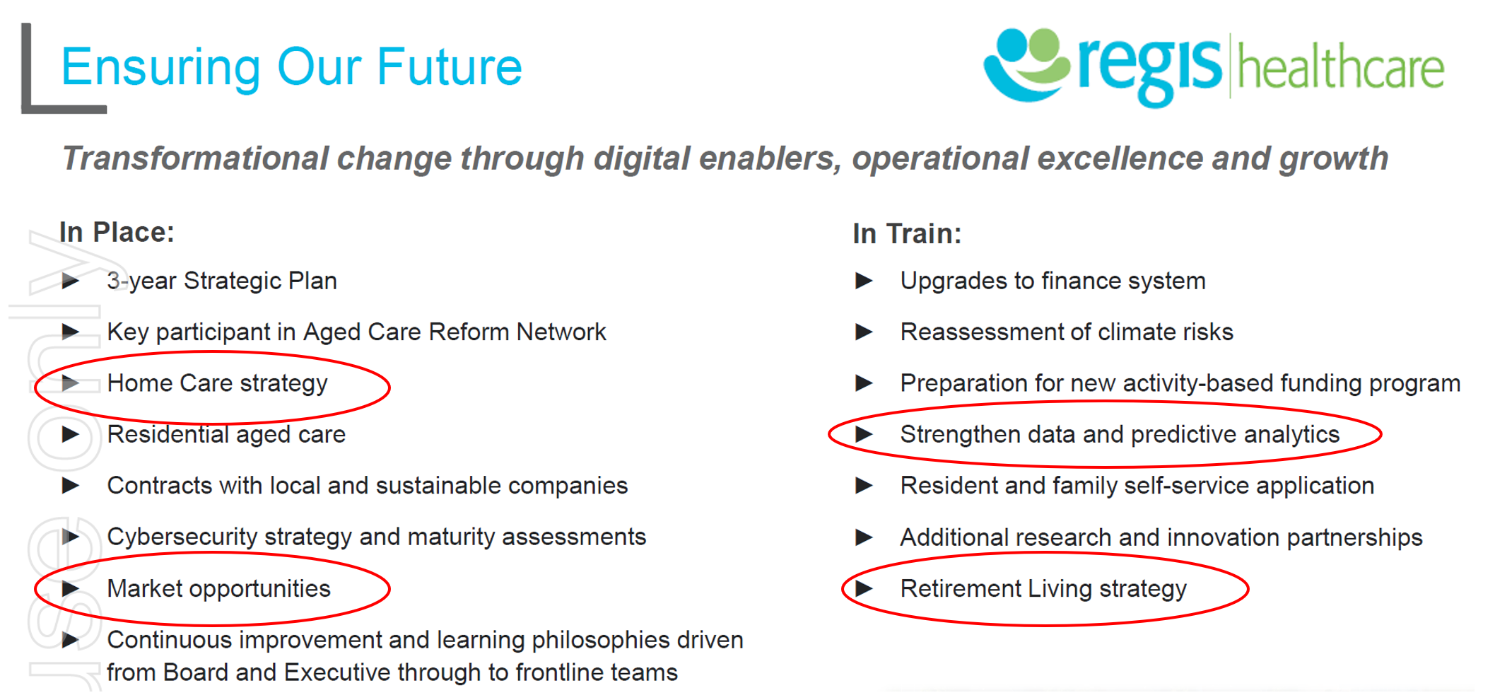 The net profit after tax was $19.9 million – which was fully distributed to shareholders as dividends (including Dorman). The 19.9% EBITDA is a stark contrast to the majority of the country’s 800 residential aged care operators, where approximately 60% are trading at a loss. There were several standout comments in the Regis investor presentation this week. The first was the emphasis on their tight management team and focus on recruiting needed talent from outside the aged care sector. The second was the repeated emphasis on digital efficiencies. The third was the renewed emphasis on home care over the next three years and retirement living beyond that.