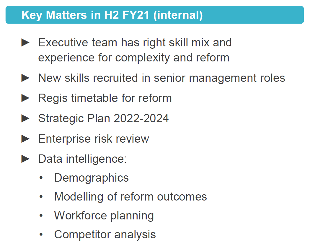 Management in addition had the challenges of the COVID-19 pandemic, the Royal Commission, the $35 million underpayment of staff revelation and a hostile takeover approach by Washington H. Soul Pattinson and Regis co-founder and Director Bryan Dorman.