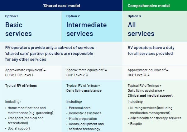 The Retirement Living Council is seeking Block Funding to underwrite ageing support services and provides three models for retirement village operators to deliver community-based care services under the Support at Home program within the village setting, either independently or through a delivery partner.