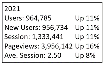 Last year 956,734 people woke up in the morning and decided to check out villages.com.au for retirement villages as an option to live in. This is a very substantial 11% more people in 2021 compared to 2020. In real numbers, this is 94,068 more people who were potential customers. And they searched more options, with Page Views up 16% to 3.956 million pages. The average time spent was two minutes and 50 seconds, 8% more time than 2020.