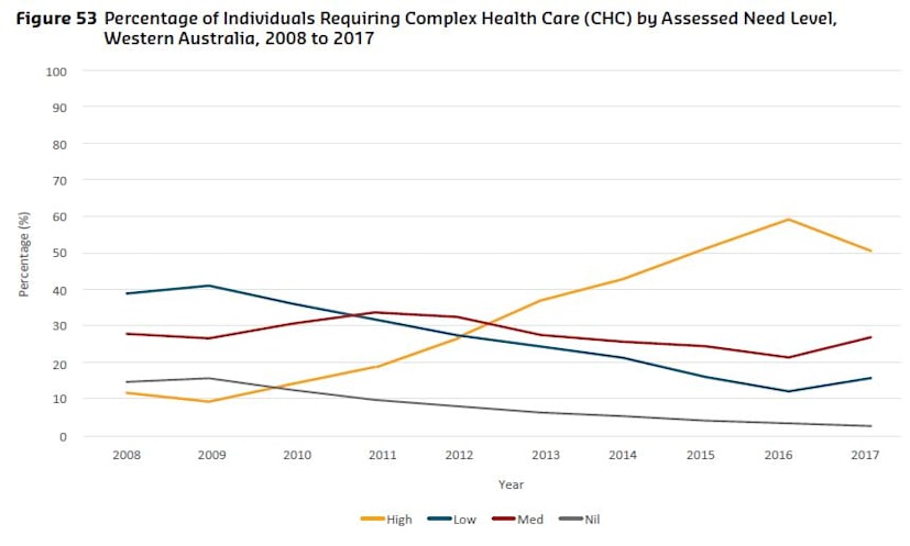 Complexity of care up. Number of workers up. Worker psychological stress up. Satisfaction way down. The number of people in residential aged care in WA with complex health care needs jumped from 12.7% in 2008 to 51.8% in 2017, according to new research released by the Bankwest Curtin Economics Centre.