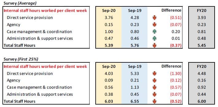 “Agency hours have declined and case management & coordination hours have increased. Administration & support services staff hours have remained fairly stable across the Survey from Sep-19 to Sep-20,” they add.