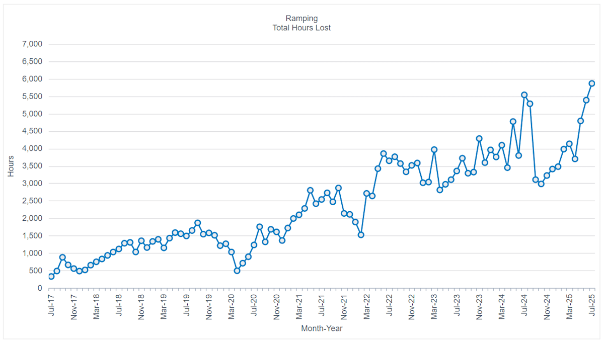 The Transition Care Service at the Pullman, a joint collaboration between SA Health, Amplar Health Home Hospital, and the Pullman Hotel, first received patients on 27 February. Since then, 200 patients have used the service receiving collectively 4,000 days of care - freeing up 4,000 hospital bed days. More than one third - 37% - of those patients have been aged care patients. We reported last week ambulance ramping in Western Australia was at a record high of 7,009 hours in July. This week ambulance ramping in South Australia also soared to record highs, reaching 5,866 hours in July - a 9% increase on the previous month.