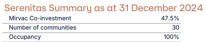 In October last year it was announced Mirvac and Pacific Equity Partners Secure Assets had agreed to pay $1.01 billion, for a 47.5% ownership each, with Serenitas CEO Rob Nichols’ Tasman Capital Partners keeping 5%. Mirvac settled its investment in March this year. However, Tasman has exercised its option to reduce Mirvac’s ownership to 40%.