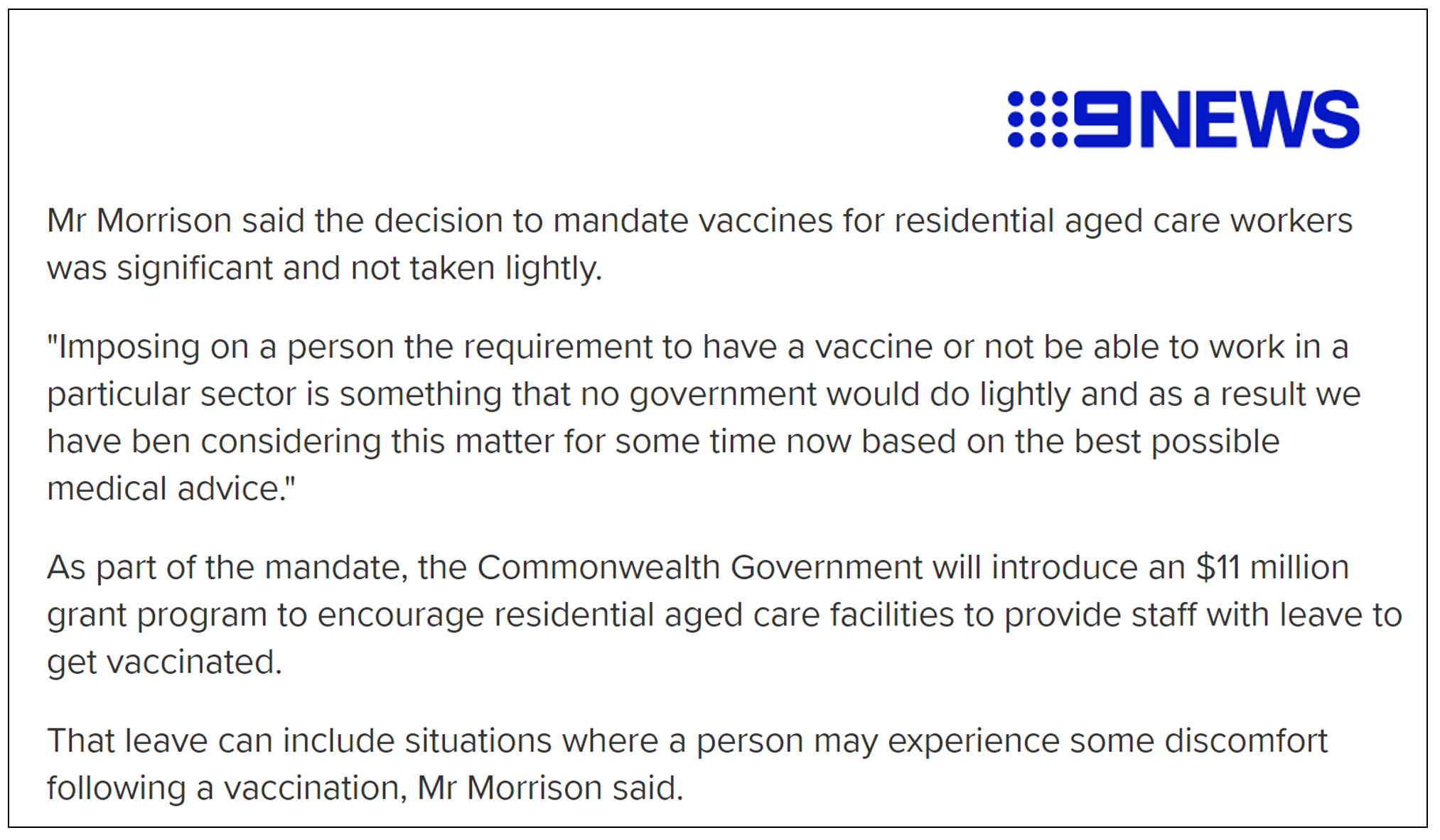 Last night, the National Cabinet agreed to make COVID-19 vaccinations mandatory for residential aged care staff across the country, 16 months after the virus was first identified and four months after the first Australian was inoculated (21...
