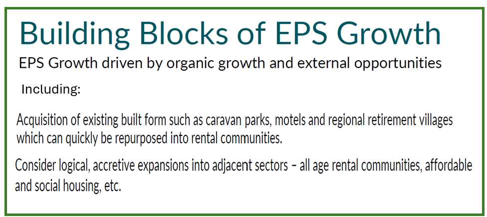 1. We have incredible levels of demand for rental accommodation driven by an ageing population and near record levels of migration. Some 35 of our 52 communities presently sit at 100% occupancy. 2. New supply is significantly constrained due to increasing construction costs and access to finance. 3. Our horizontal Build to Rent model lends itself perfectly to modular offsite construction which I used extensively during my time at Ingenia Communities; 4. There is really no capital formation in the horizontal Build to Rent sector. I see many similarities with our sector to where land lease communities were a decade ago.
