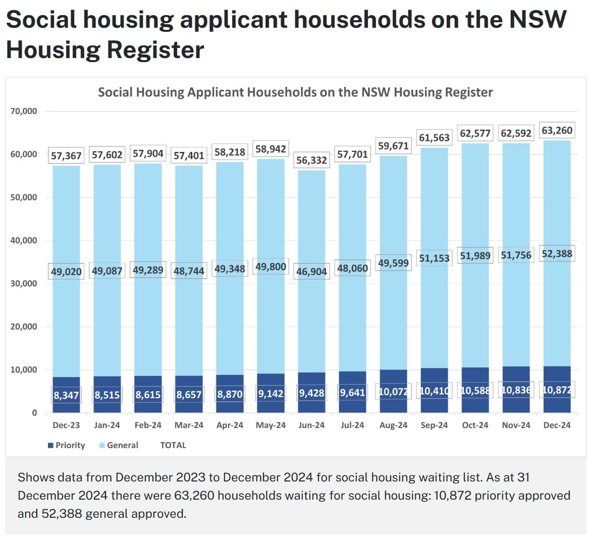 In every state in Australia the wait list for social housing is increasing. NSW Government’s own figures released in December last year showed the delivery of priority social housing, including seniors, was the second lowest in 2024. 63,260 people are on the waiting list for social housing in December last year, with 10,873 deemed priority (the highest number in 2024).