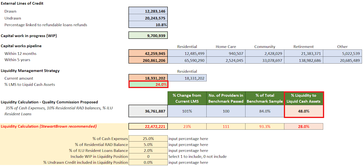 The report noted concerns in relation to the modelling used by the Commission. "The modelling was performed on the FY18 - FY22 period and should be updated to consider the latest financial performance. The direct care funding model was changed (ACFI to AN-ACC) in that period, occupancy levels have dramatically risen and the funding reforms as contained in the new Aged Care Act 2024 are specifically designed to improve revenue flows and sector profitability. In this sense, the funding reforms are revenue driven with no additional impact on recurrent costs," said StewartBrown. As proposed in their earlier submission, made in March, StewartBrown recommends liquidity ratios of: