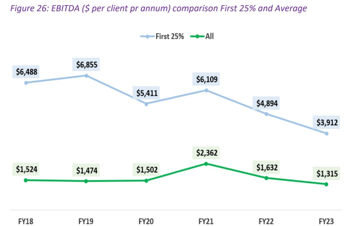 Separately, the introduction of the Independent Health and Aged Care Pricing Authority (IHACPA) to aged care is considered significant because they recognise as an independent reviewer that an ‘administration fee’ and a ‘margin’ are requirement for a sustainable business. Home care – referring to the chart below – is however being homogenised, meaning the Top 25% of home care providers’ profitability is declining to match the overall sector. StewartBrown sees this as the loss of capacity to innovate or provide superior services. Competitors are increasingly delivering the same homogenised care.