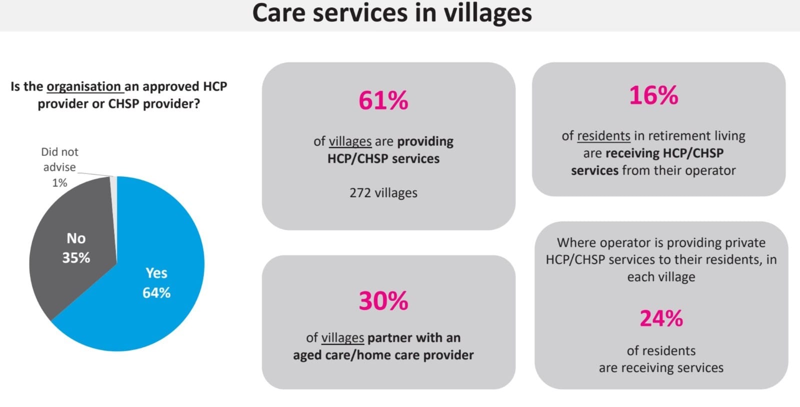 Stuart highlighted in “snapshots of the survey” 83% provide residential aged care, 56% of operators have home care services in operation, 44% provide rental properties, and 16% assisted living services.