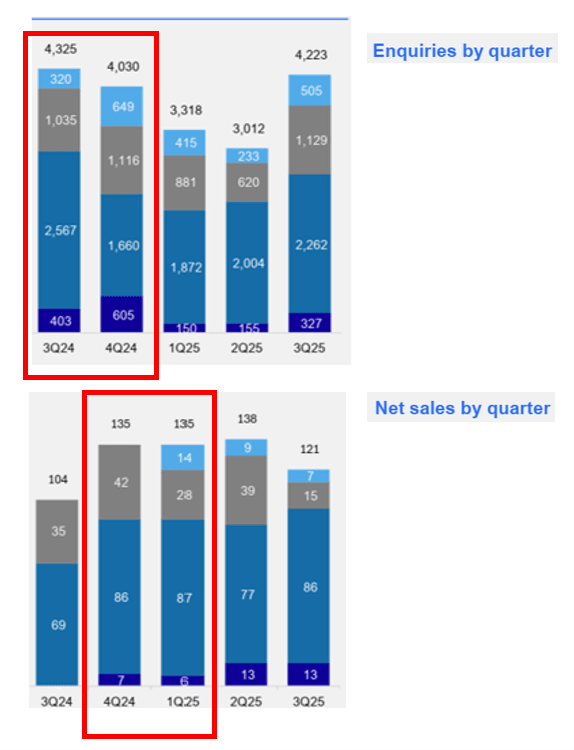 Seniors accommodation has worked out very well for Stockland after abandoning retirement villages, with a big development pipeline, big sales numbers and big development profit in its relatively new land lease business. Its Q3 ASX results have revealed continued strong interest. The chart below shows that each month, Stockland generates over 4,000 new home buyer enquiries per month and a conversion rate of 3%, or 130 buyers each month.
