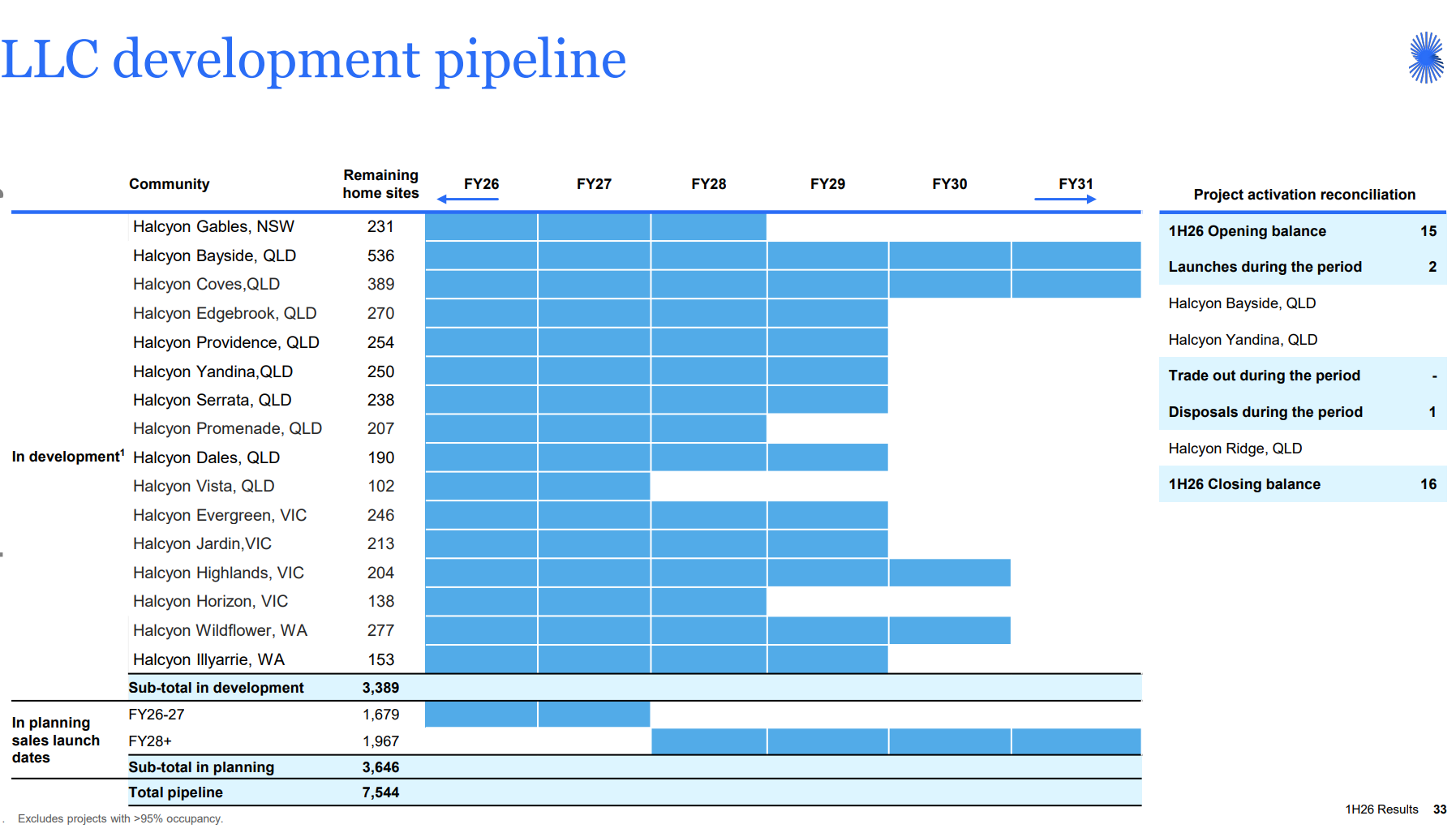 The group says it is actively trading from 16 land lease communities, with the launch of Halcyon Yandina and Halcyon Bayside, both in Queensland, in 1H26.