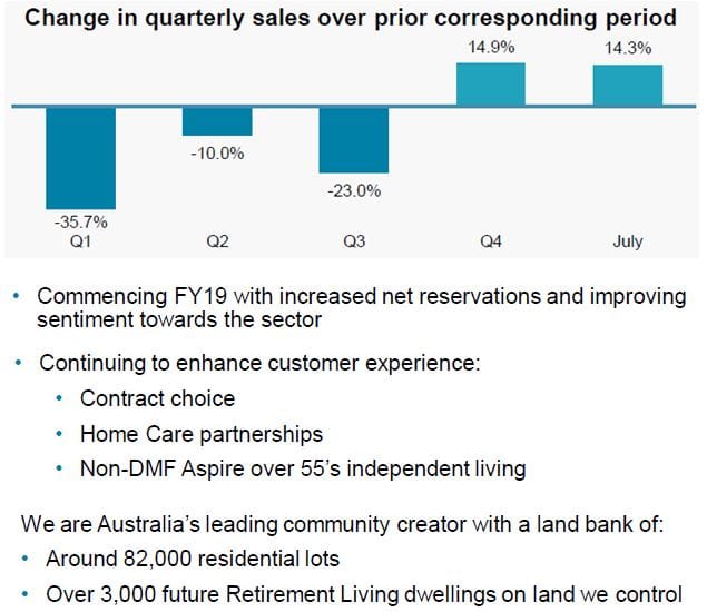 Stockland turned over 113 fewer retirement homes in FY18 compared to FY17, reducing their operating profit from $63 million to $55 million, a drop of 16.7%. Importantly for the ASX-listed business, its 2014 objective to build its return on assets (ROA) from 4% to 8% by FY18, which was on track, fell back to just 4.6%. The company appoints 100% of the blame to the impact of the June 27 (2017) Four Corners program and following Fairfax/ABC campaign against retirement villages in general and Aveo in particular, with its “Bleed Them Dry Until They Die ” campaign. Aveo’s resales were down 44% across the same 12 months. In the three months following the TV program Stockland sales were down 36%. They recovered slightly October to December but crashed again in the traditionally bestselling months of January to March – 23% down on the previous year. However, they see consumer confidence slowly returning, with April to June sales up 14.9% and continuing in July. It appears that with sales going south the company hunkered down. Their sales, general and administrative costs were paired back over the 12 months from $39 million to $38 million. They did not increase marketing and sales budgets significantly in response to the loss of consumer confidence in retirement villages. Well before the negative media campaign, Stockland took the initiative of introducing its non-DMF Over 55’s village concept Aspire, which it now wishes to expand nationally from two locations to eight or more, providing ‘choice’. They have also introduced increased choice of retirement village contracts. Interestingly their average tenure was 9.0 years which compares to Aveo’s 10 years – for which it received major criticism by the media which label this turnover rate as ‘churning’ residents. Looking forward, Stockland is predicting an average tenure of 10.9 years, which will delay their DMF income. As reported here last week, Retirement has now been merged into their Residential division, where it will be the minnow, with a development pipeline of 3,000 sites compared to the larger division which has 82,000 building sites. Across their 65 villages and 9,600 units, the average village age is 25 years, meaning to keep their value Stockland will need to continue refreshing the product, which they have been doing extensively. With the backlog of 113 extra homes to sell on top of the 60 that turn over every month, the pressure will continue on sales, marketing and refurbishments.