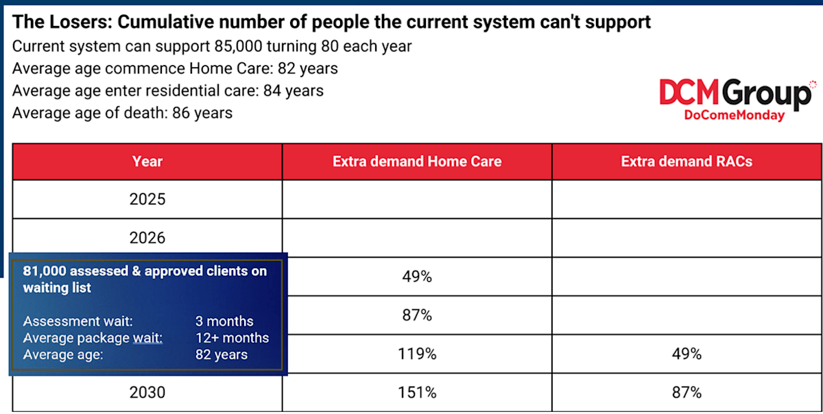 We get it; it’s an election budget, and as Paul Keating used to say, ‘if you are not in power, you have no power’. So winning the election is the primary goal for Labor. But we are at one minute to midnight in that all services for ageing Australians are maxed out at a time when their numbers are about to triple (being the number of people turning 80 each year). It is four years ago last month that the Aged Care Royal Commission’s Final Report was tabled in Parliament, and we find ourselves with inadequate ageing services for this year, not in five years (2030). Our analysis below (supported by the Business Council of Australia research) shows that by 2030, there will be 1.5 people waiting for a Home Care Package for every person with a Package. And there will be 0.87 people waiting for an aged care bed for every bed occupied.