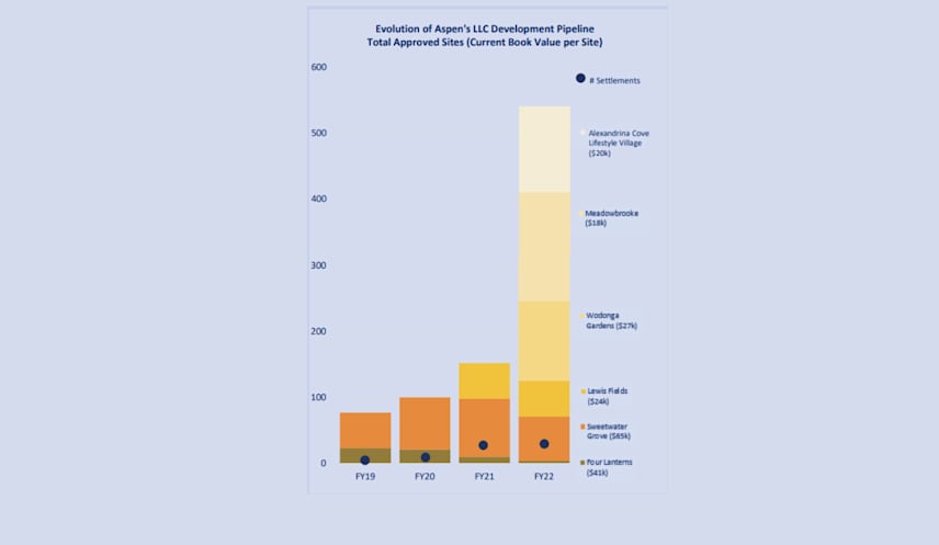 Revenue from Aspen’s retirement operations increased by 26% to $4.7 million in the 2021-22 financial year. Profits increased 25% to $5.3 million. The number of retirement community dwellings nearly doubled over the course of the financial year, increasing 88% to 1,101.