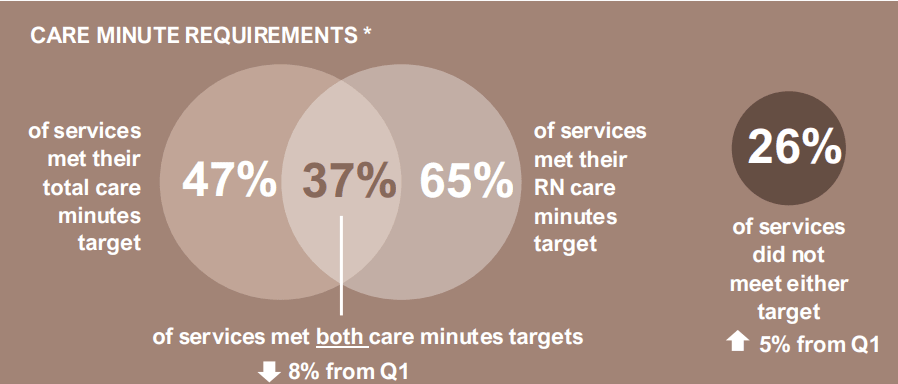 Care minute compliance is biting. Despite a 6.5% lift in average minutes delivered in Q1 FY25, only 45% of residential homes hit the mandated benchmarks – see below.
