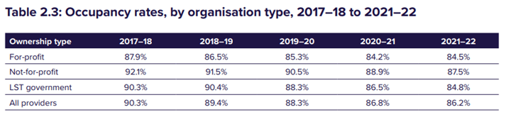 The continued decline in occupancy also eroded profitability. Average occupancy across all residential care places was 86.2% in 2021–22, down from 86.8% in 2020–21, and 88.3% in 2019–20.