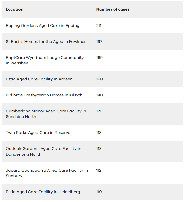 For aged care deaths, the number of residents and staff with infections across 120 locations is still high; see the Top 10 below.
