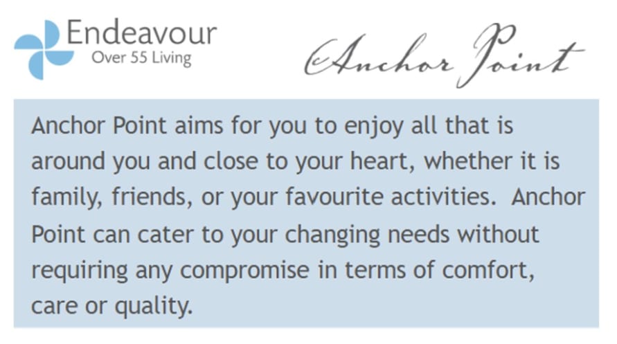 Anchor Point is positioned as an ‘Over 55 living community’ and its website promotes lock and leave independent living, but in the detail it acknowledges that it is a retirement village and care support will occur as your needs change.