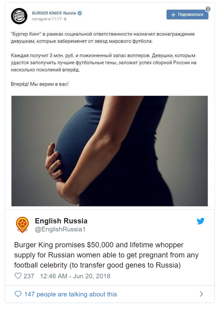 To ride on the popularity of FIFA World Cup, Burger King Russia started a promotional campaign tweeted this: