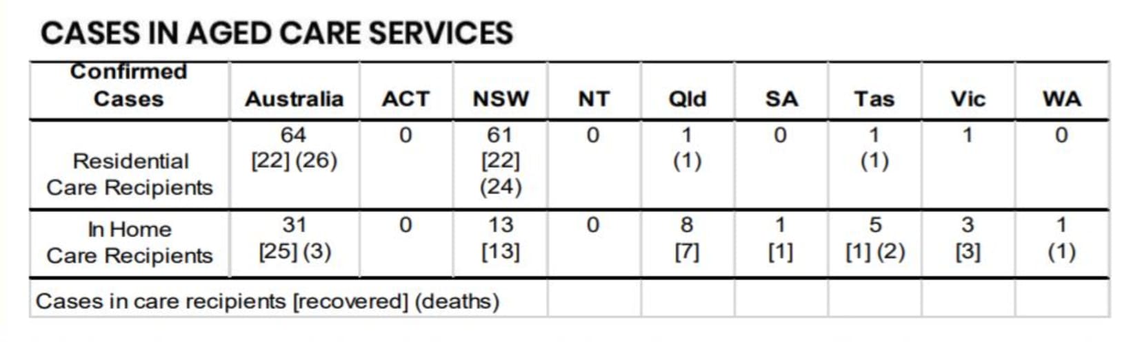 In total, there have been 94 cases among aged care residents and home care recipients, of which 29 people have died – a 30% fatality rate.