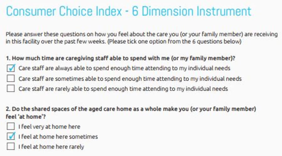 Designed by Flinders University, the Consumer Choice Index – 6 Dimension (CCI-6D) questionnaire aims to measure six characteristics of quality care: