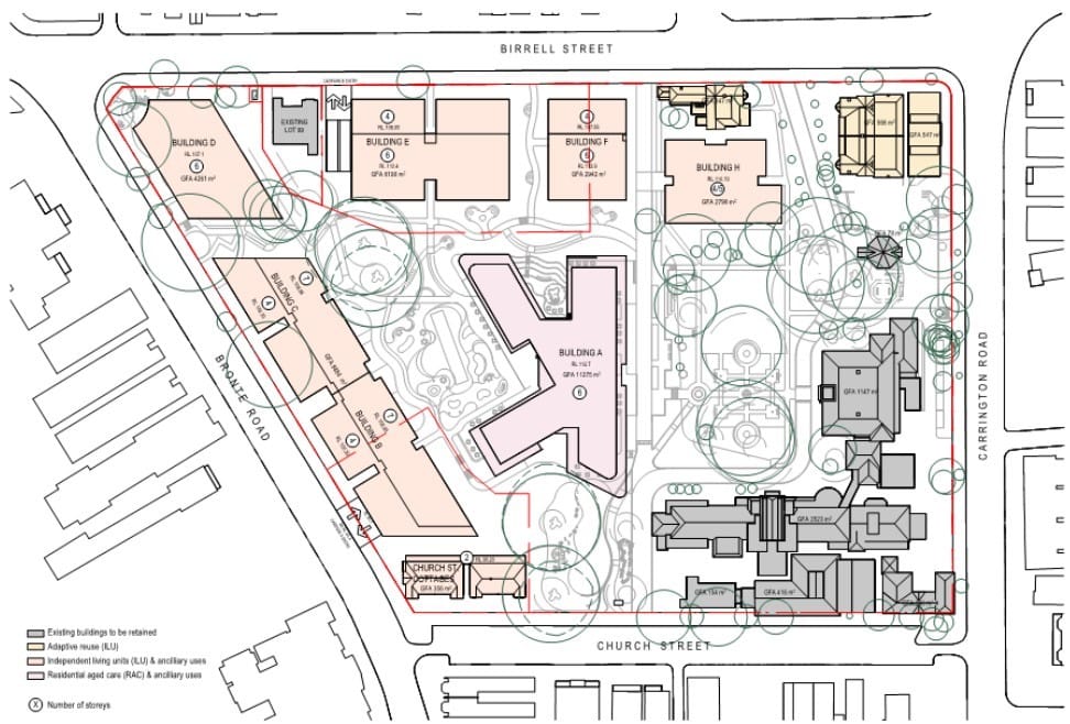 A scoping report by Willowtree Planning has been given to the NSW Planning & Environment Department which shows it plans for 210 – 230 seniors living units and 105 – 114 new aged care beds across a total of 43,000sqm of floor area. These units will be split between six buildings ranging from 14 – 24m in height.