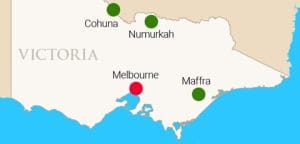 Cohuna is 274km north of Melbourne (population 3,000), Maffra is 220km east of Melbourne (population 5,000), and Numurkah is 196km north of Melbourne (population 4,500).