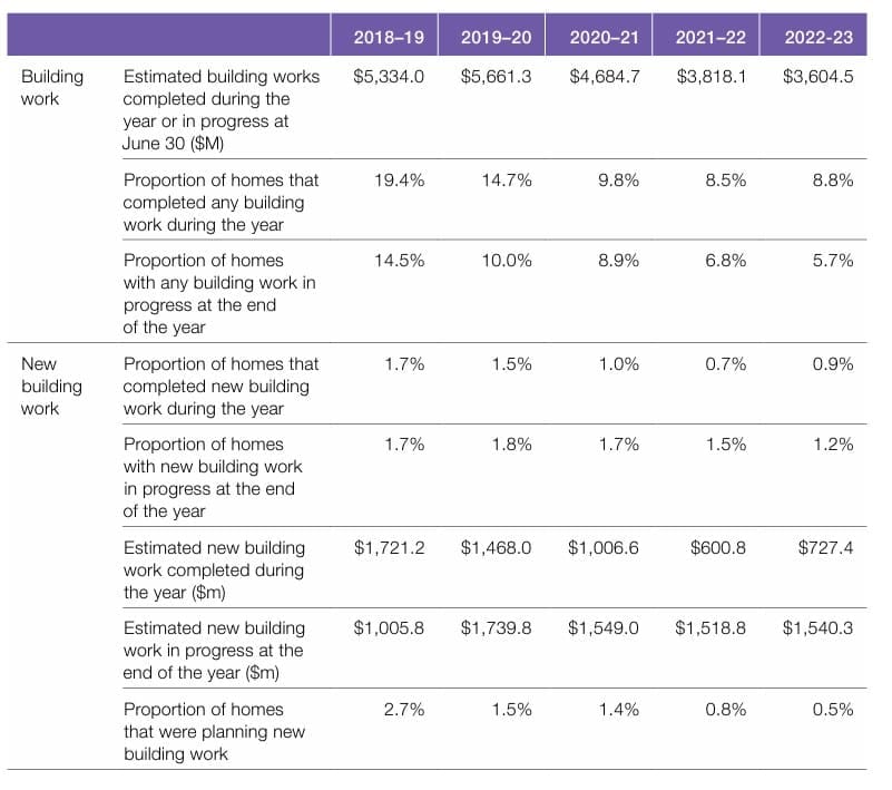 If you needed proof the aged care bed drought is real, look no further than the latest Operation of the Aged Care Act 2023-24 which came out on Tuesday (26 November). Page 112 of the 144-page report reveals the estimated value of building work across the sector has fallen yet again to $3.6 billion, down from $5.3 billion five years ago. Only 0.9% of homes completed new building work during the 2023-24 financial year, while just 0.5% of homes were planning new building work. That’s around 130 homes based on our back-of-envelope calculations. 7.6% of homes finished upgrades during the year, down from 11.5% in 2018-19.