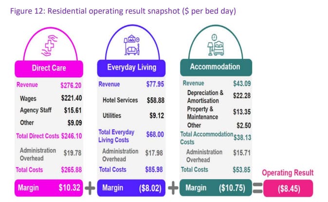 Residential aged care losses were made in the delivery of everyday living and accommodation services, with accommodation the heaviest drag on results. The reforms in the new Aged Care Act include additional funding streams for these services through being able to charge higher Refundable Accommodation Deposits (RADs) without requiring approval and increased consumer contributions for non-clinical care (from 1 July 2025). Other notable points from the report are as follows: