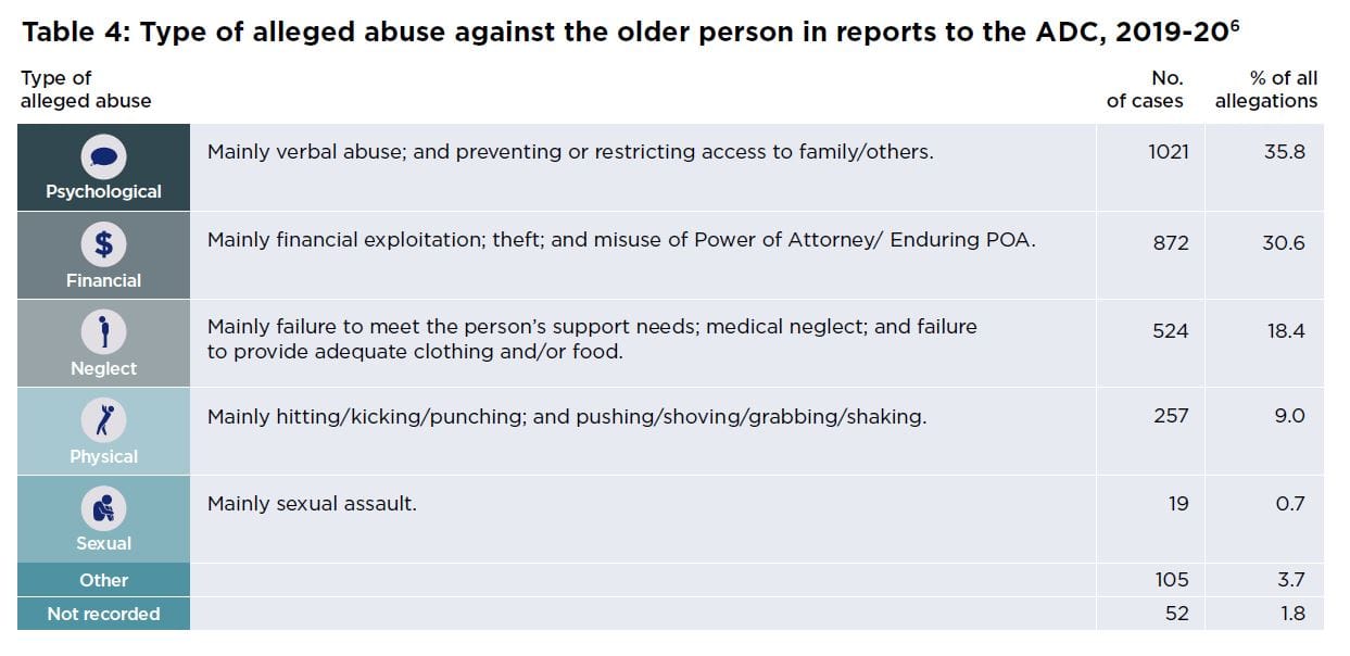 Recently we reported on the increase in calls to NSW’s Ageing and Disability Commissioner post-COVID. Now the Commission has released its first-ever annual report – and the findings are interesting. Over two-thirds (69.6%) of the 1,777 reports to the ADC about older people involved older women with the majority aged between 80 and 84. One-third (32.5%) of reports were made by adult children, followed by one quarter (23.5%) by paid workers and 14% by the older person themselves. Family members were also most likely to be the target of allegations, with 56.7% of allegations around the person’s adult children and 11% about a spouse or partner. Psychological abuse was the main type of abuse reported (35.8%), including verbal abuse; and preventing or restricting access to family/others, with financial abuse (30.6%) – mainly financial exploitation; theft; and misuse of Power of Attorney/Enduring POA – and neglect (18.4%), including failure to meet the person’s support needs; medical neglect; and failure to provide adequate clothing and/or food rounding out the top three.